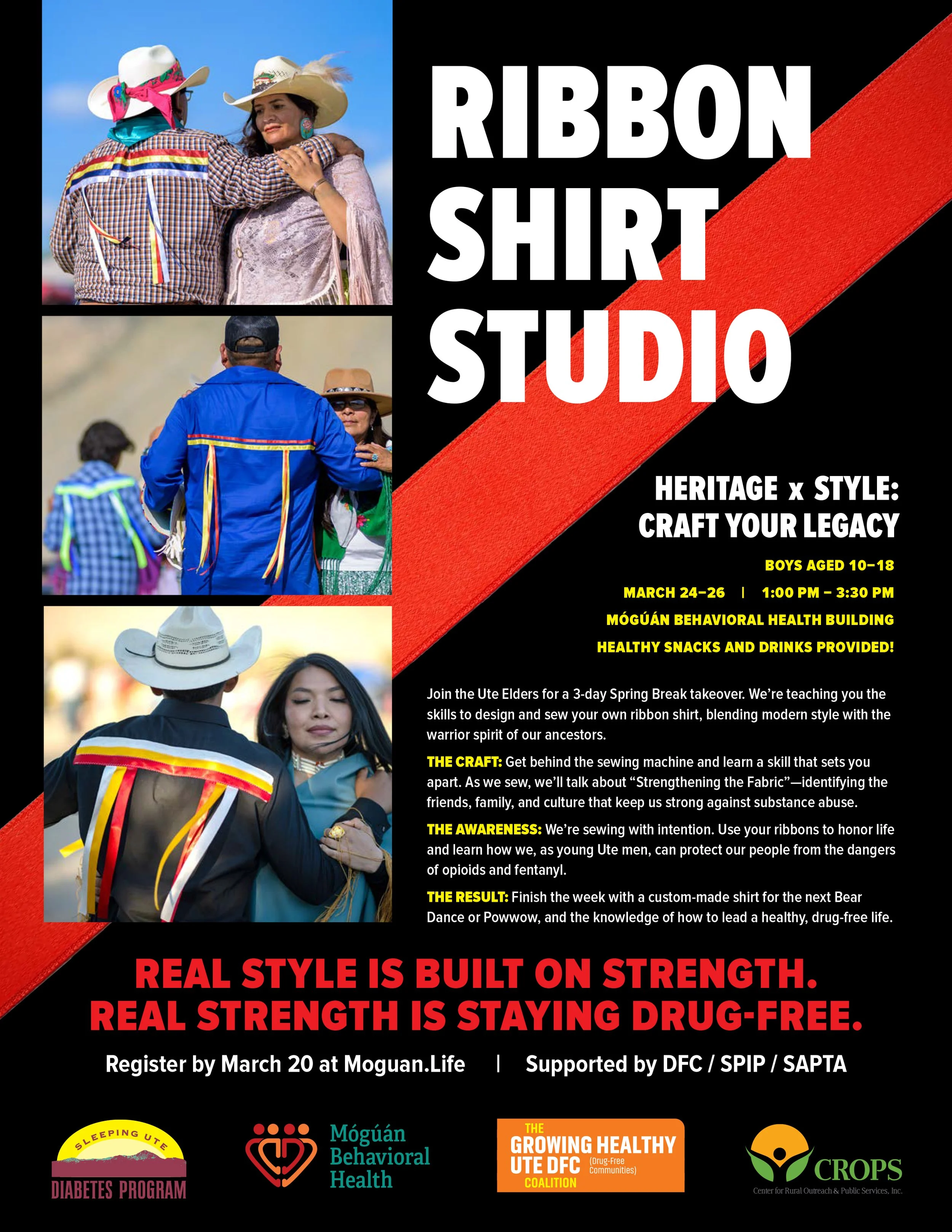 Ready to level up your wardrobe with something that actually has a soul? This Spring Break, come learn with our Ute Elders and create a custom ribbon skirt/shirt from scratch. Whether you want bold and bright or deep and traditional, this is your space to create a look that is 100% you and 100% Ute. All the supplies and materials for this workshop are included.